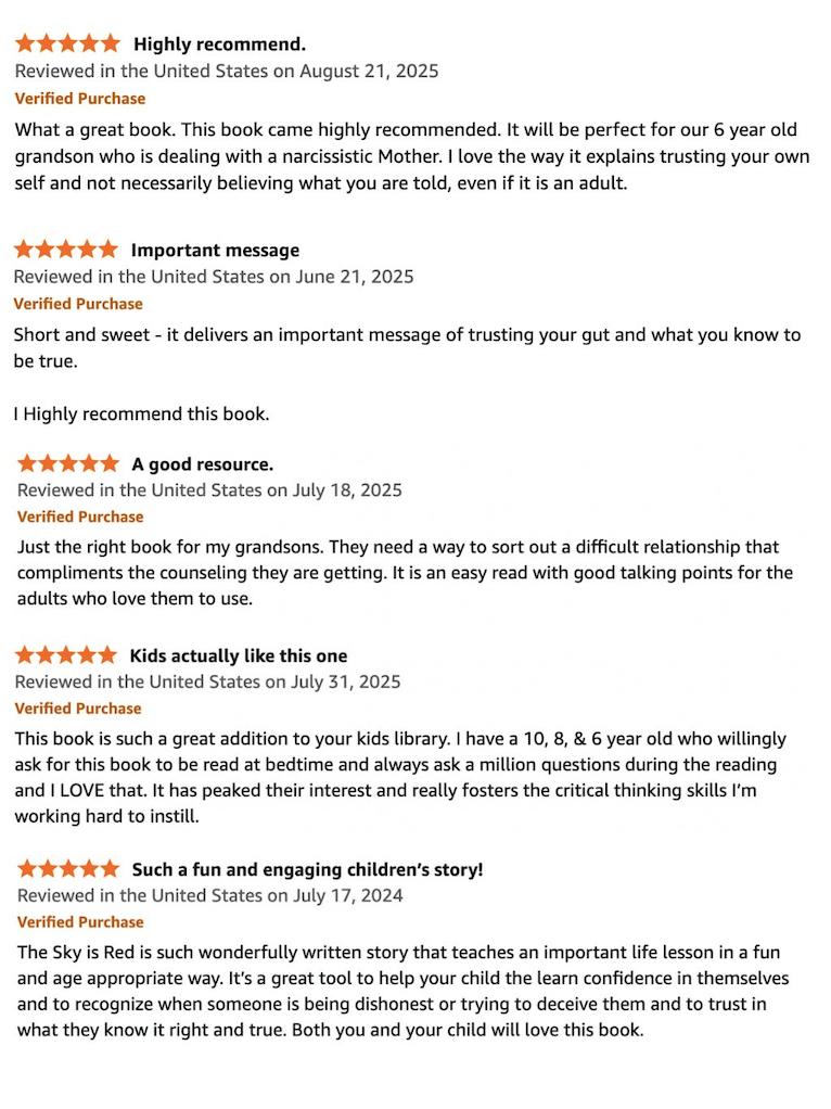 The Sky is Red was created to encourage children to stand up for what they believe and to remain confident enough to trust themselves, even when faced with pressure not to. Teaching children to trust themselves is a great way to build self-confidence, self-esteem, and protect them from gaslighting, manipulation, and peer pressure. There are situations that arise throughout our lives where our inner strength is challenged, and we are pressured to ignore our feelings or what we know to be true. The Sky is Red paints a clear (age-appropriate) picture as to why it is so important and rewarding to trust yourself.